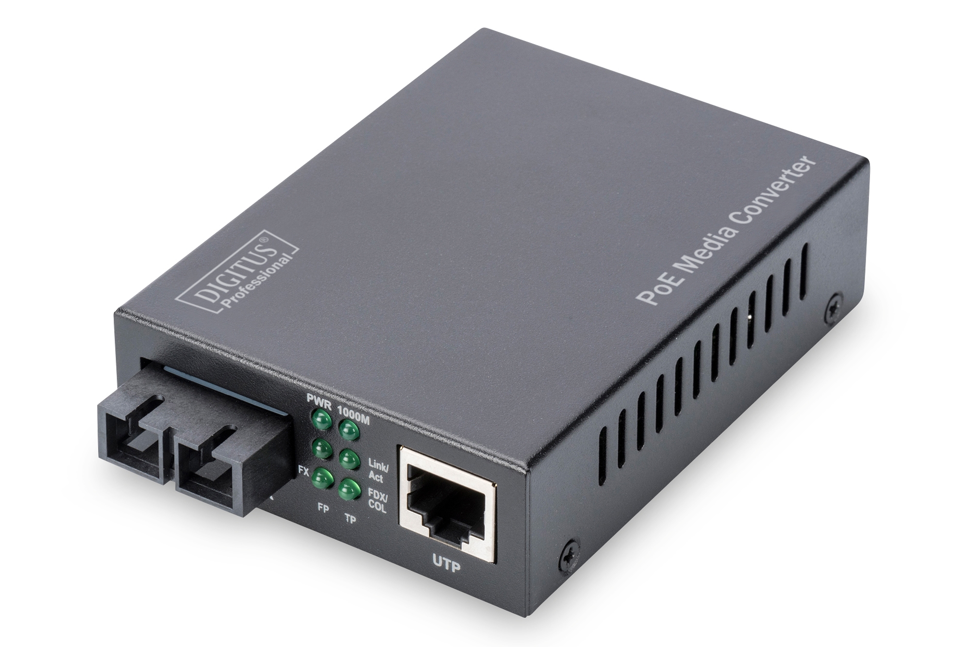 Convertitore multimediale DIGITUS PoE, modalità singola, Da 10/100/1000 Base-T a 1000Base-LX, incl. alimentatore 30W, connettore SC, fino a 20 km