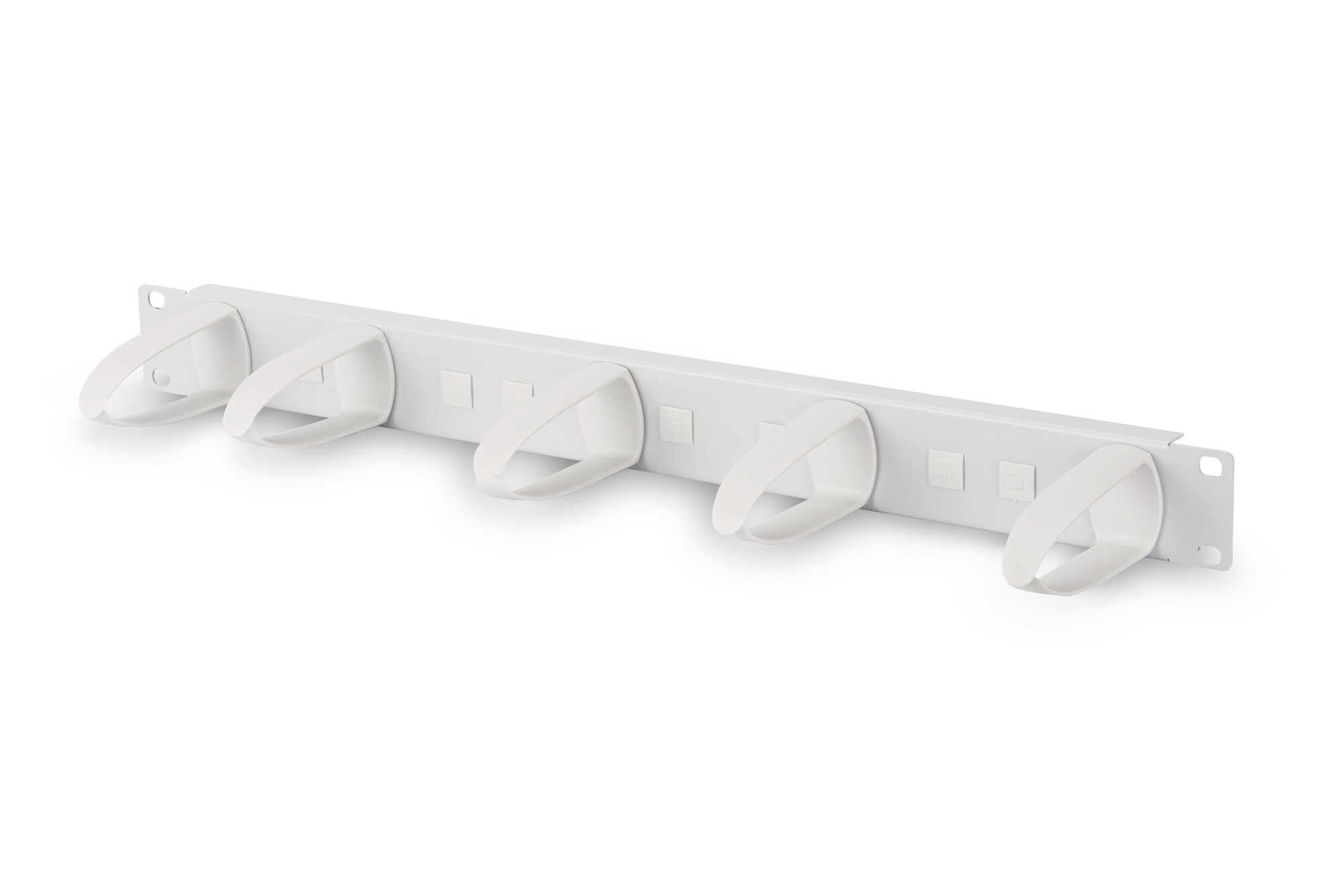 Pannello di gestione dei cavi di rete 1U, con 5x fascette Supporto del cavo, 31 x 85 mm, girevole e sostituibile, incluso Materiale per il fissaggio, RAL 7035