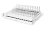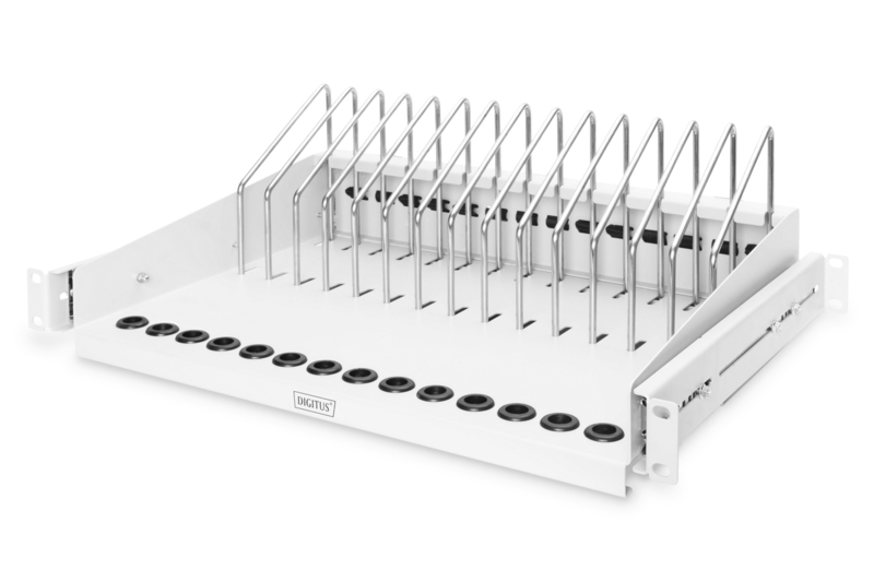 Con questa mensola speciale è possibile usare qualsiasi armadio comunemente in commercio da 482,6 mm (19") per riporre i propri dispositivi mobili come PC tablet, portatili o smartphone. Le robuste staffe d’acciaio possono alloggiare fino a 14 dispositivi. Sul lato frontale sono previsti dei passacavi per poter cablare in modo ottimale i propri dispositivi e collegarli, ad esempio, alla rete elettrica per ricaricarli. Il lato inferiore è dotato di vano per i cavi di eccessiva lunghezza. Per consentirne la facilità d’utilizzo, una volta montata la mensola può essere estratta in avanti per accedere in modo rapido e veloce ai componenti collegati. Sul piano a 482,6 mm (19") serve soltanto un’unità di altezza (1UH) per poter fissare la mensola. L’altezza totale, compresa staffa di metallo, è di 175 mm.
