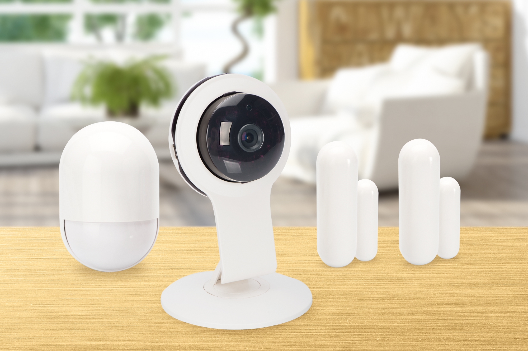 Starter-Kit Security composto da 1 telecamera per interni HD da 720p, 1 sensore di movimento e 2 sensori a contatto, include una telecamera per interni HD 720p, 1 sensore di movimento e 2 sensori a contatto, colore bianco