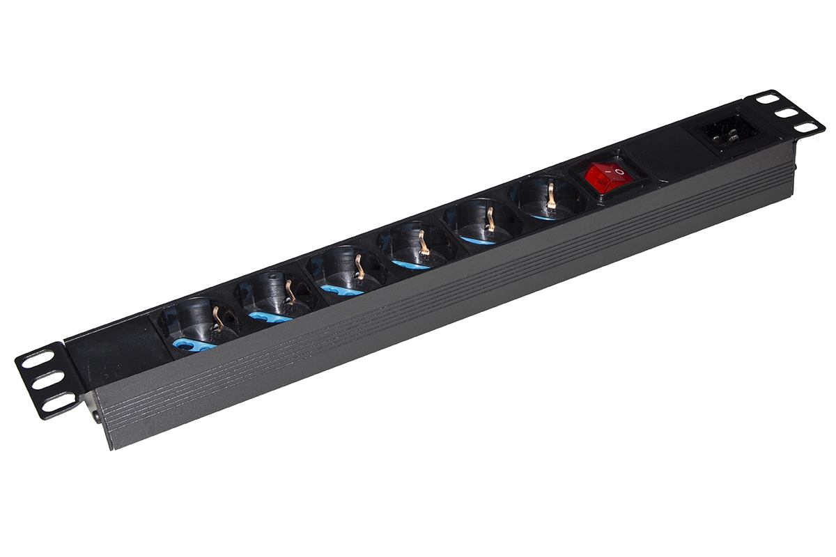 Con 6 prese universali Schuko tedesche e italiane tripolari UNEL 2P+T 16A femmina disposte a 35 gradi e un presa C20 per il collegamento di un cavo.