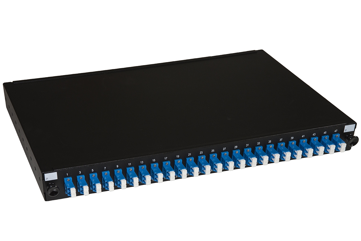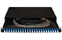 Pannello estraibile per fibra ottica in acciaio con 24 adattatori per fibra ottica LC Duplex Singlemode 9/125 e pigtail installati.