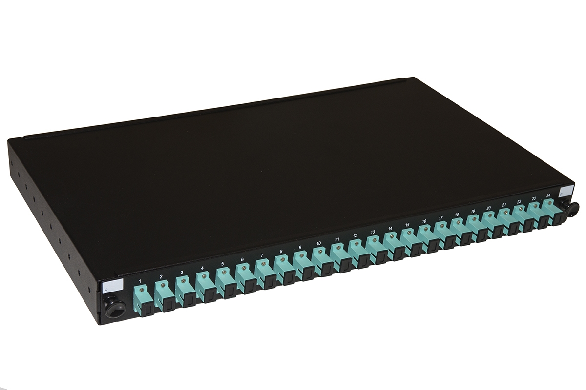 Pannello estraibile per fibra ottica in acciaio con 24 adattatori per fibra ottica SC Simplex OM3 e pigtail installati.