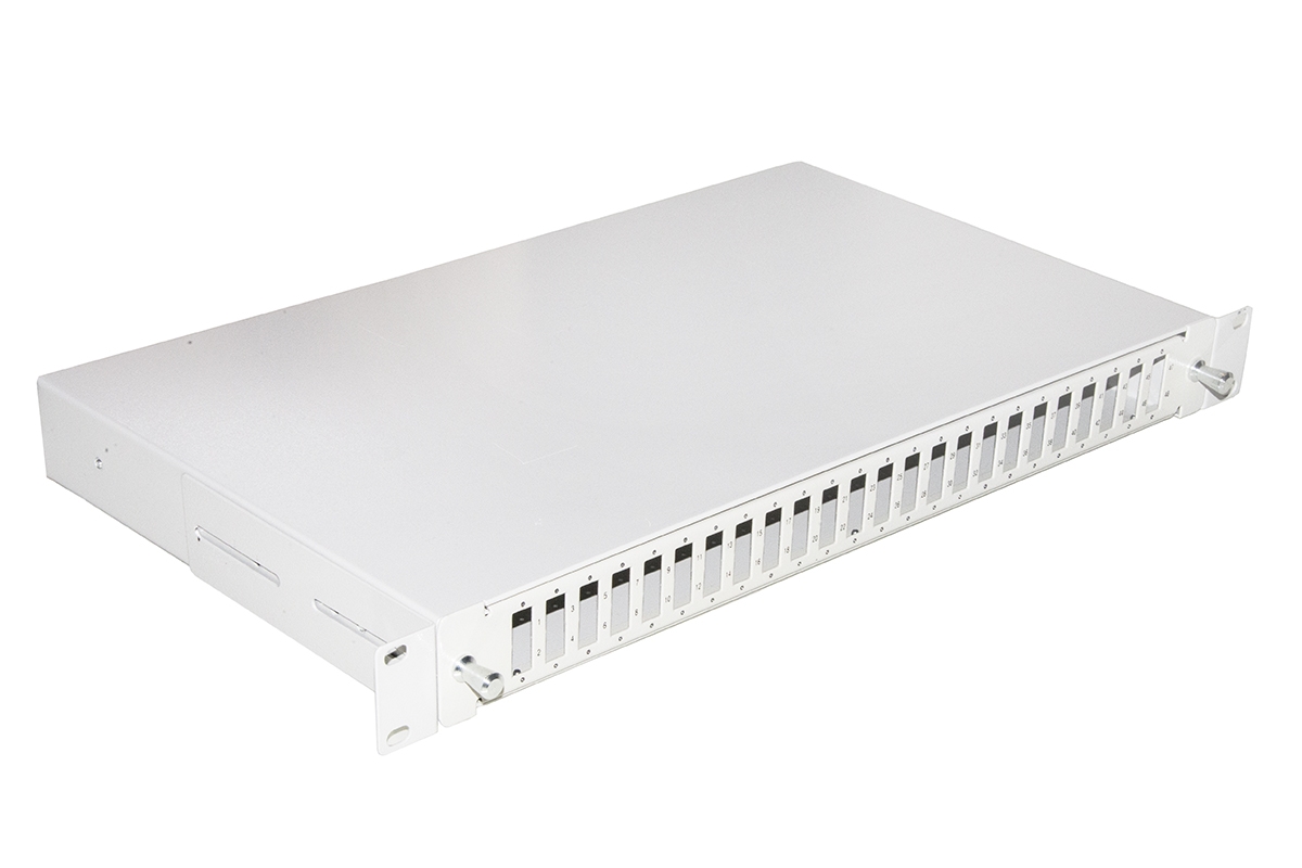 Pannello patch estraibile su binari per fibra ottica con 24 porte per inserimento degli adattatori Duplex SC.