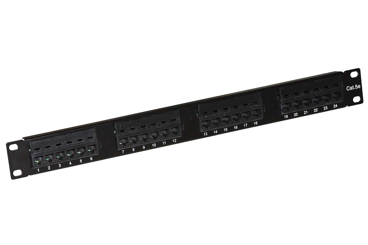 Pannelli patch per installazioni di rete con connettori RJ45 UTP Categoria 5E 8 poli inclusi, ogni serie di connettori ha un cartellino la codifica del colore, secondo le specifiche colori EIA/TIA 568B oppure 568A.
