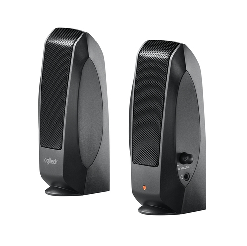 Speaker stereo Logitech con controllo volume e accensione nello stesso tasto. Potenza totale audio in uscita 2,6 Watt RMS.
