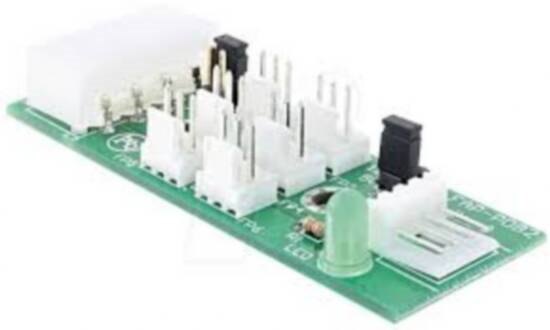 Questa schedina di distribuzione ha 6 connettori da 3 poli, viene alimentata tramite un connettore 4-Pin 3.5 Molex o 4-pin FDD.