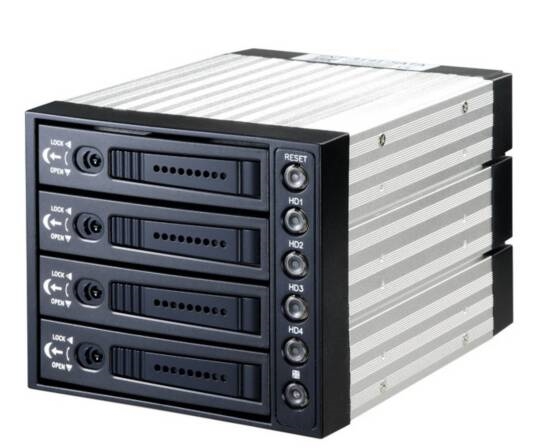 Interfaccia SAS o SATA I, II, III. Occupa 3 alloggiamenti da 5.25" per 4 HD da 3,5". In alluminio, colore nero, con una ventola di raffreddamento. La connessione degli Hard Disk sul backplane non necessita di cavi.